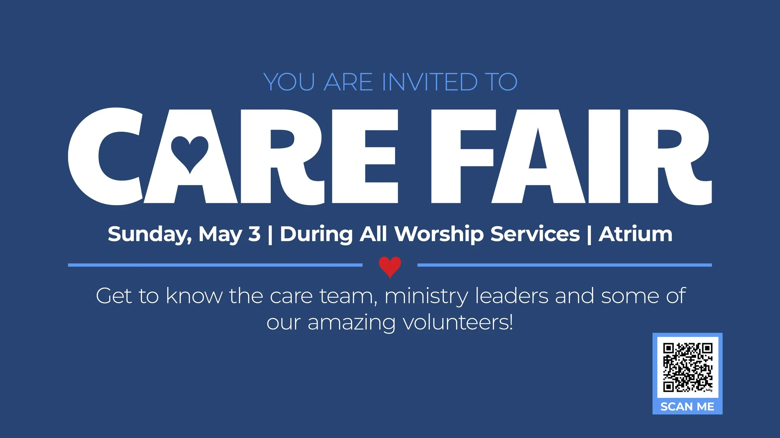 Stop by the Atrium during one of our three Worship Services on Sunday, May 3, and get to know our care team, ministry leaders and some of our amazing volunteers! Text CARE to 77978 to learn more about our Care Ministry, or click here.