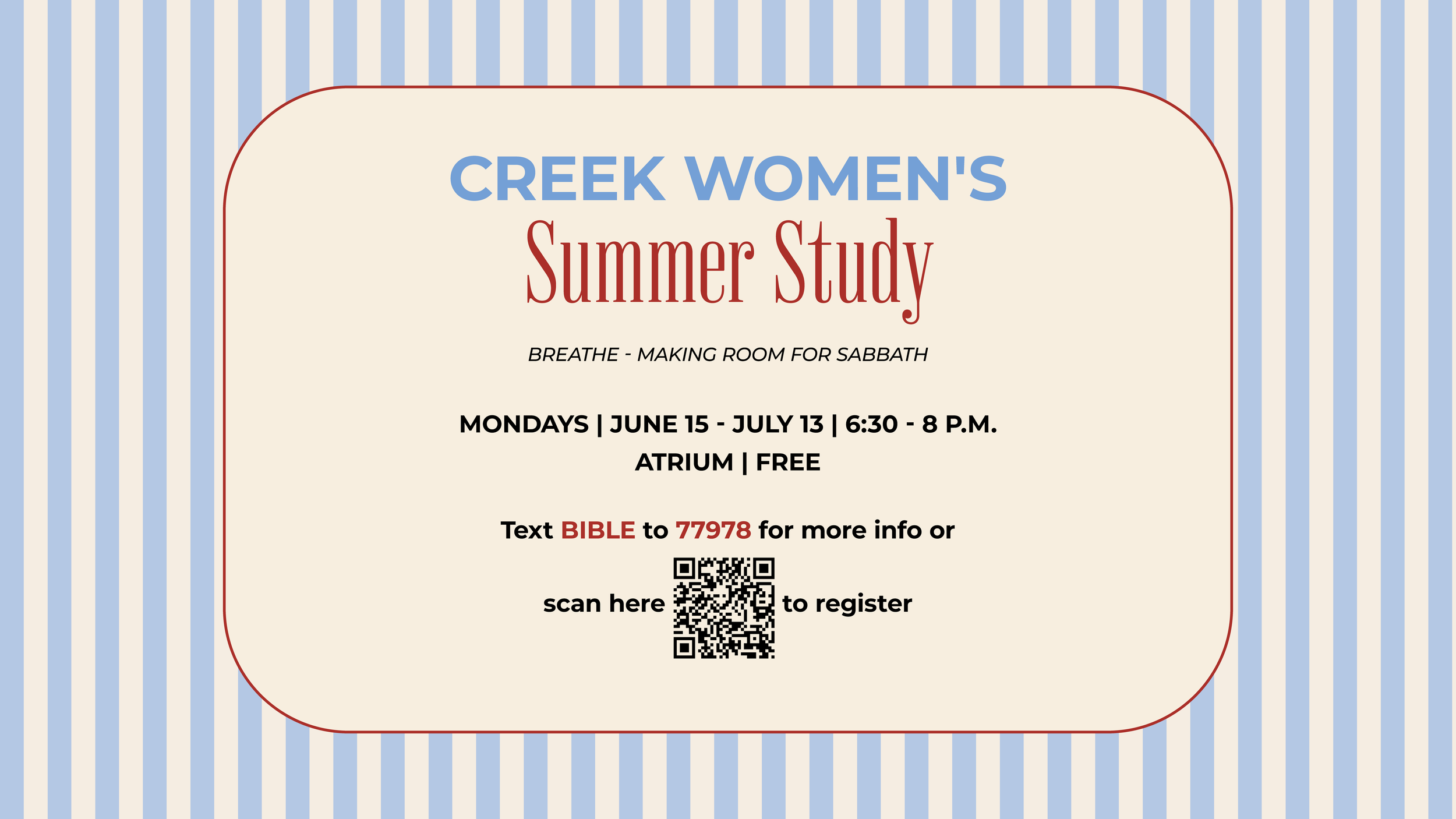 Join us this summer for a refreshing and encouraging Bible study! Each week, we'll begin with a time of teaching, followed by breakout sessions where you can connect with other women in a setting that fits your season of life.